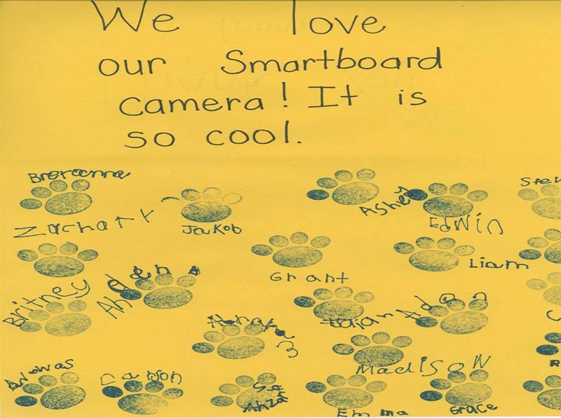 R.B. McAllister’s Champions Grant provided 7 Document Cameras to be used in conjunction with their existing SMART Boards. Approximately 160 students and 8 teachers benefit from the cameras on a daily basis. The technology helps all grade-level students with reading, writing, math and more. Check out the photos below of the cameras in use and the great thank you notes we recieved from the students: